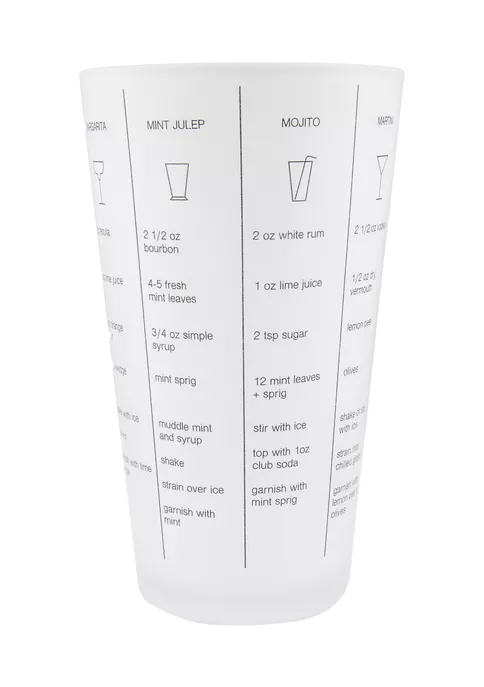 Always have your favorite drink recipe handy with this Frosted Glass Recipe Shaker. The shaker is constructed of frosted glass and a stainless steel lid with a built-in strainer. This strainer features classic, easy-to-read recipes and measure markings for an Old Fashioned, Negroni, Moscow Mule, Margarita, Mint Julep, Mojito, and Martini.