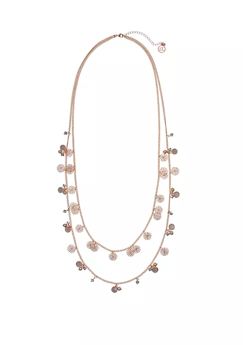 Pre-layered for effortless style, this long, 2-row necklace by Erica Lyons keeps your style standards intact with its various disc drops and shaky beads.