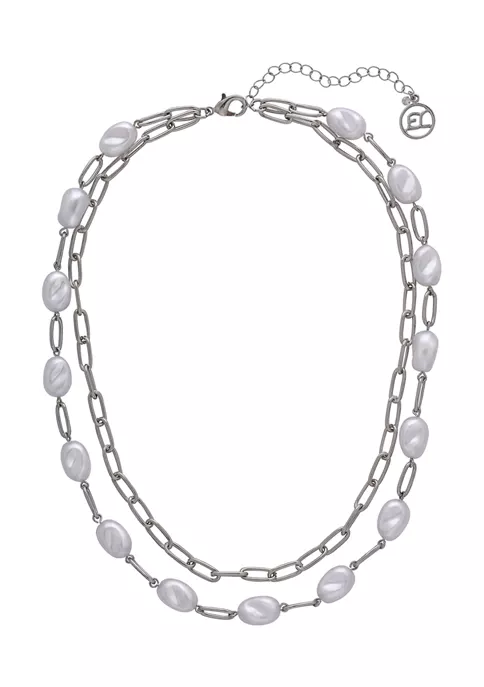 A two-row chain silhouette flanked in shimmery pearls enriches the flair of this polished collar necklace from Erica Lyons.